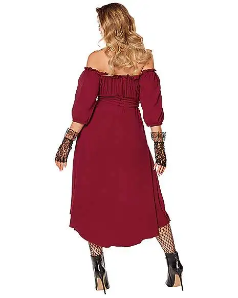 Looking for the perfect dress to wear for Halloween? This glamorous burgundy peasant dress is sure to be a hit this spooky season.
