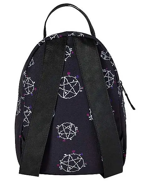 Strap up with bold style and take on the day with this Pentagram Mini Backpack! This sleek backpack is stylized with pentagrams and roses and features two outside zipper pockets. For the perfect touch of edgy flair, this backpack is sure to get the job done.